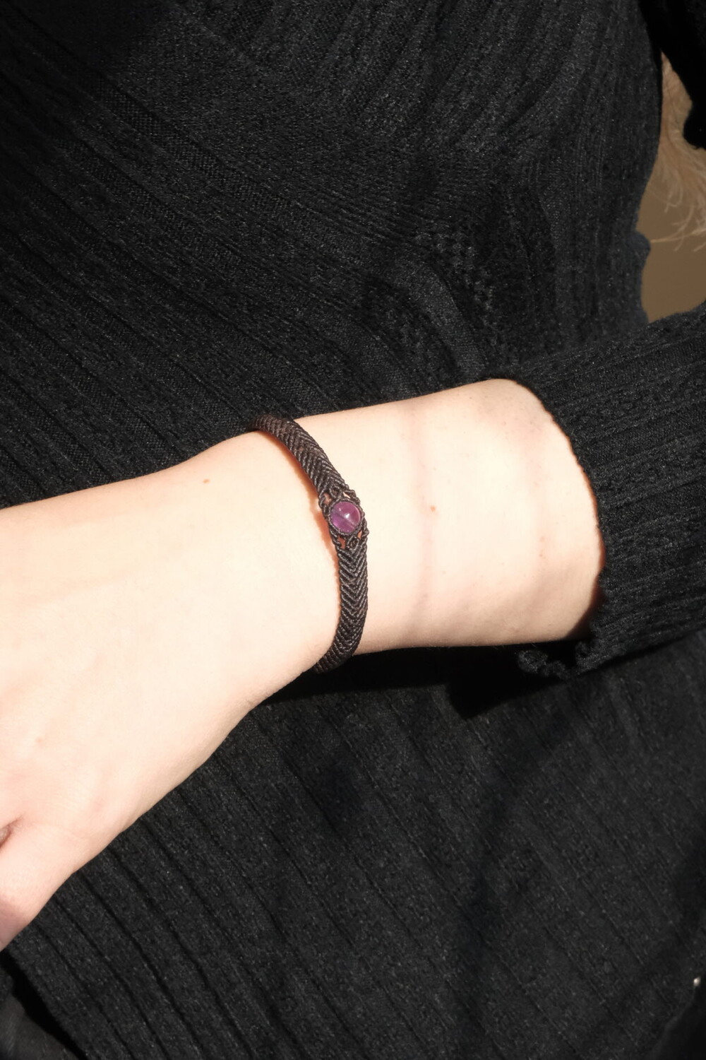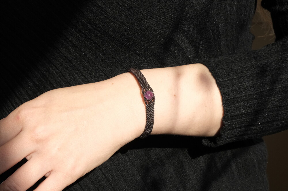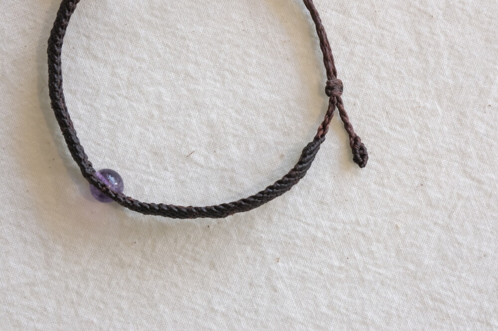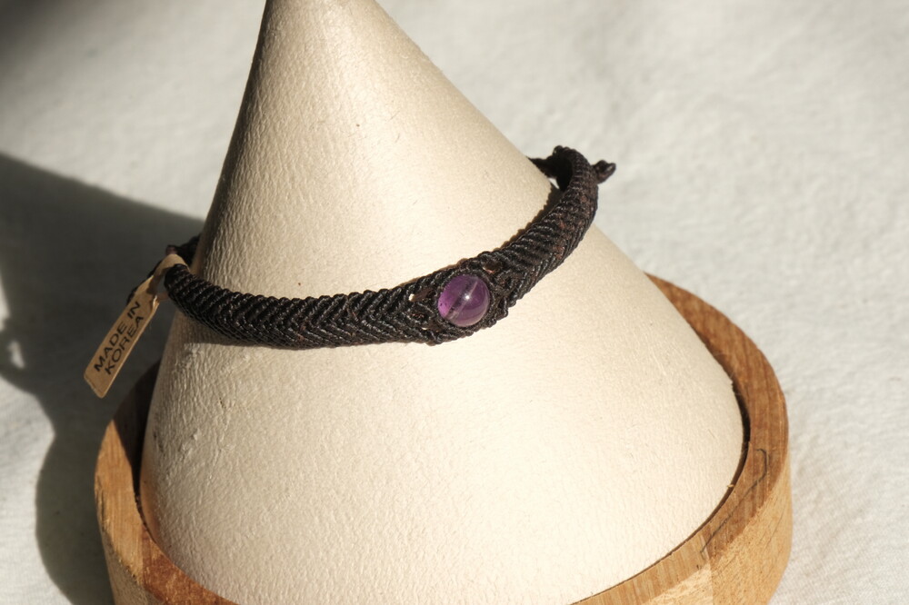 6mm크기의 자수정 원석과 린하시타남미실 0.5mm 실로 제작한 브이자 매듭 팔찌입니다.