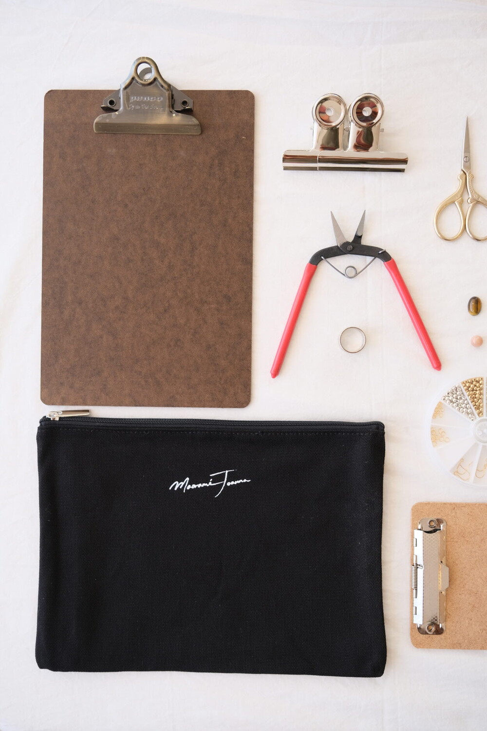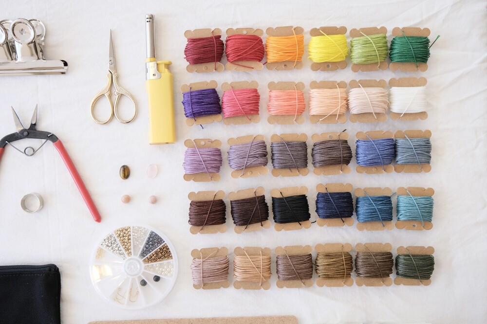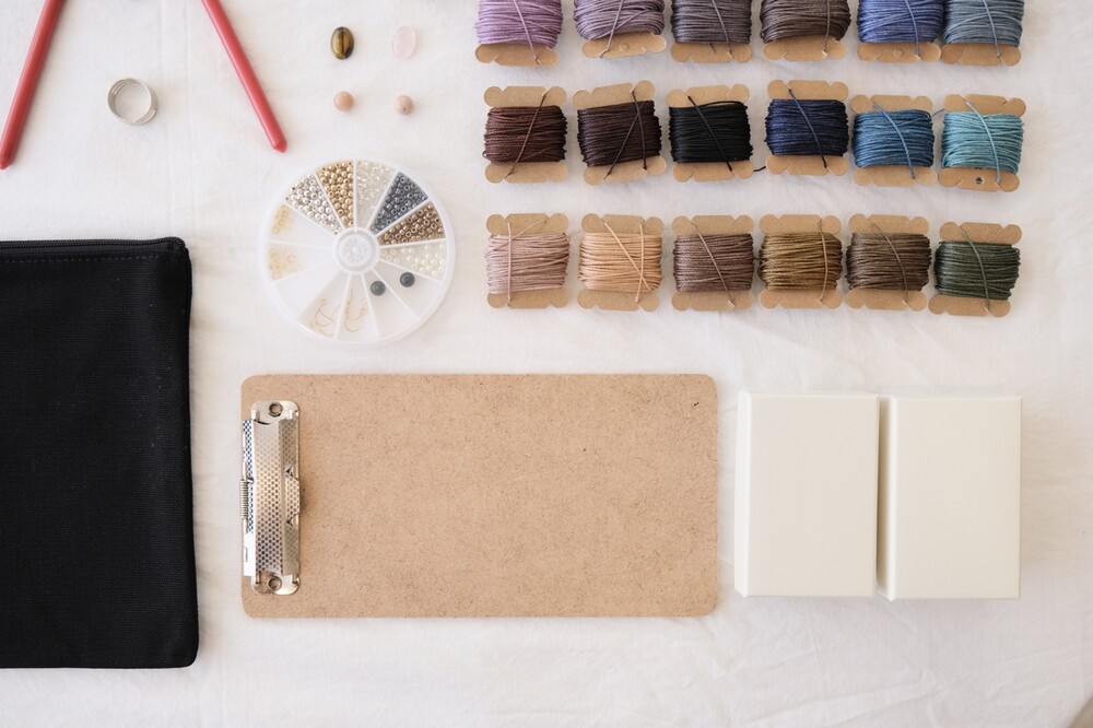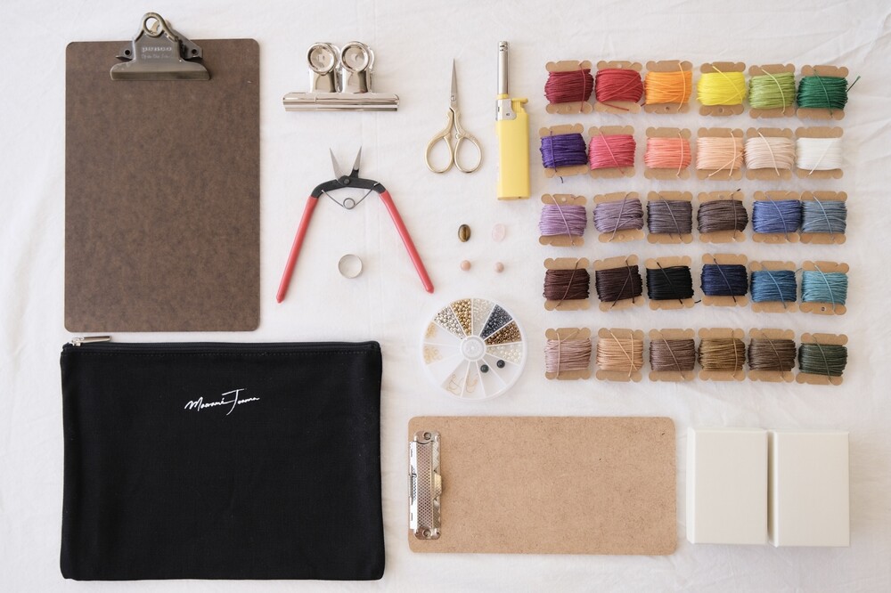 마크라메 액세서리의 기본 재료인 실과 비즈 등의 부자재를 아주 넉넉하게 담은 키트에요. 원석 그리고 매듭 지을 때 필요한 클립보드, 가위 등의 기초 도구 뿐 아니라 보관이 용이한 파우치, 이동하면서 사용하기 좋은 사이즈의 클립보드까지 알차게 구성되어 있는 키트입니다.