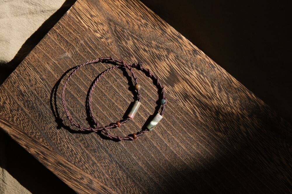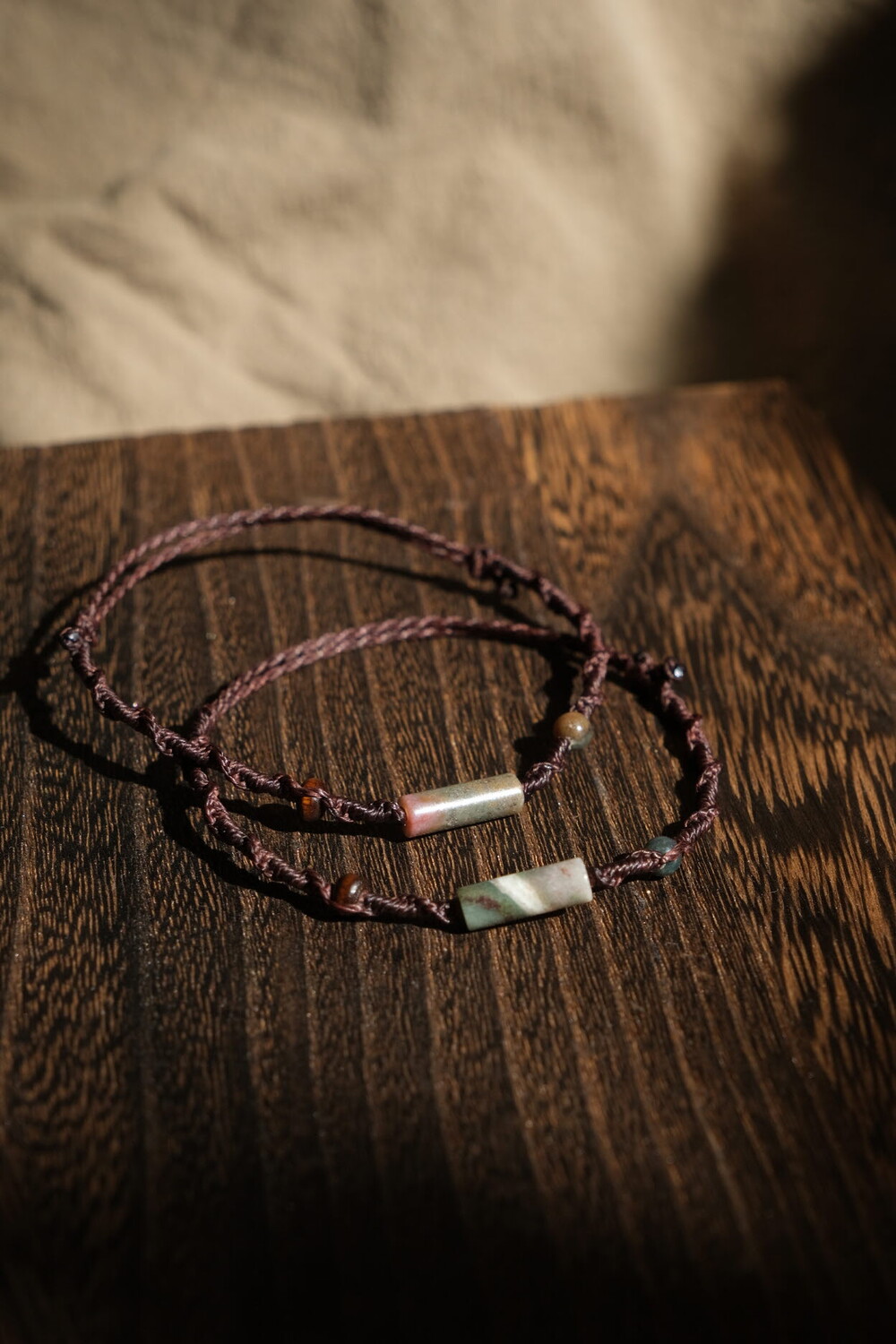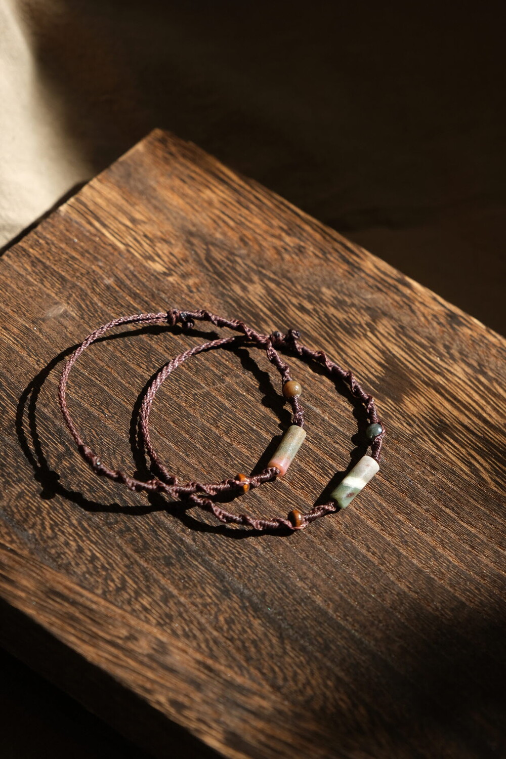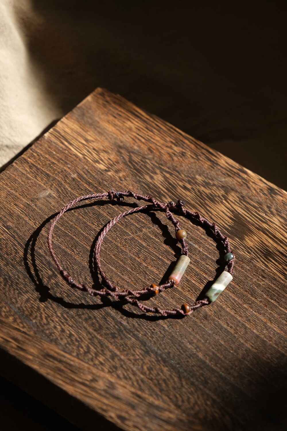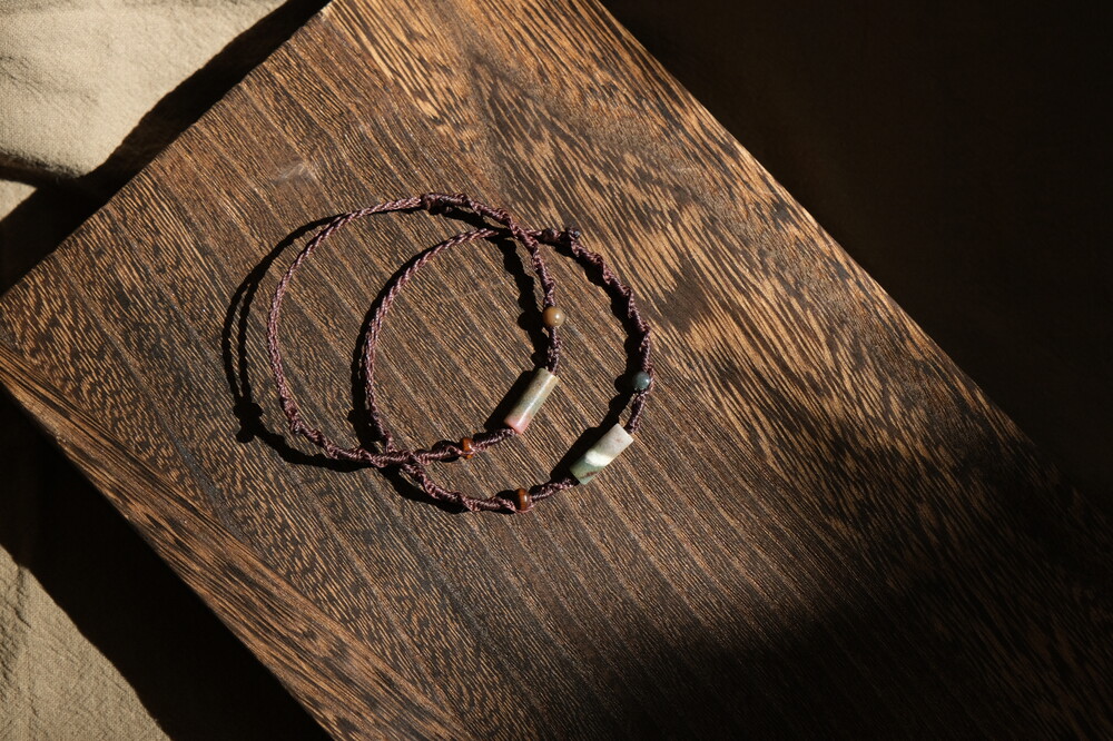 원형 막대 모양의 원석으로 제작한 매듭 팔찌입니다.