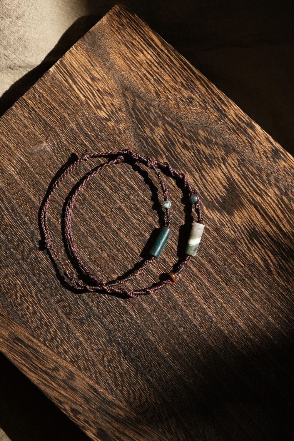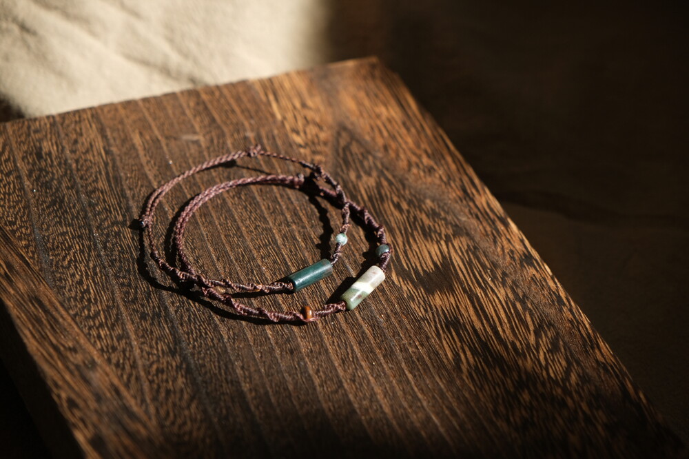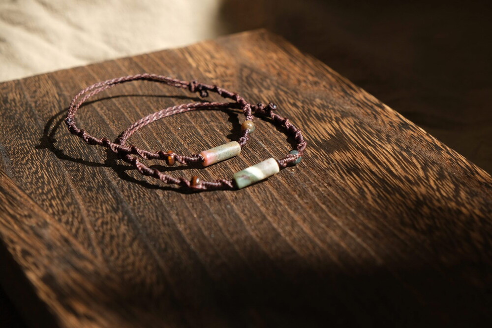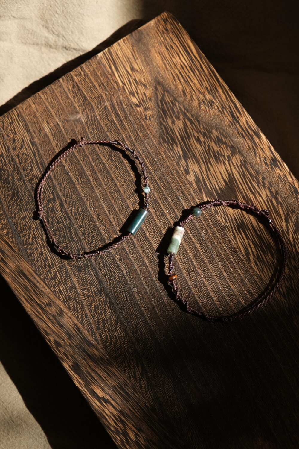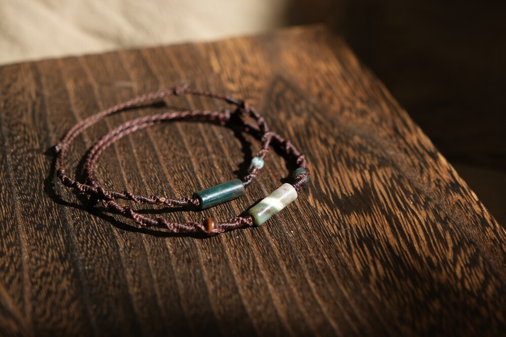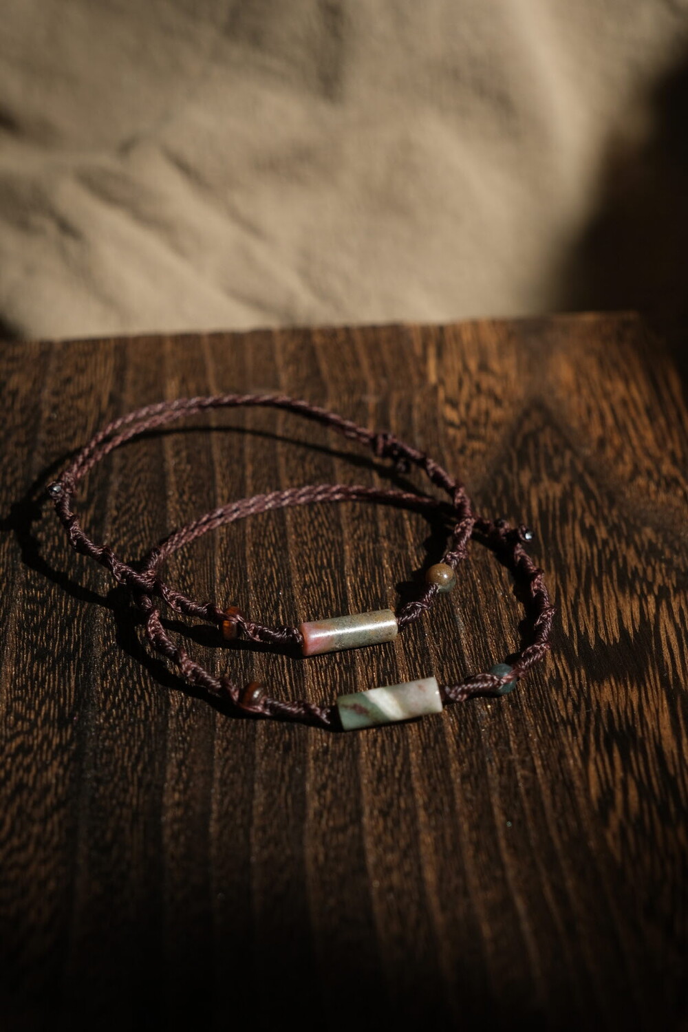 원형 막대 모양의 원석으로 제작한 매듭 팔찌입니다.