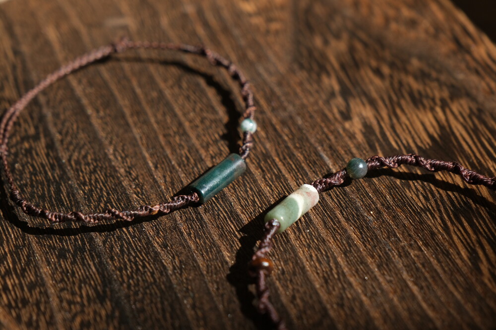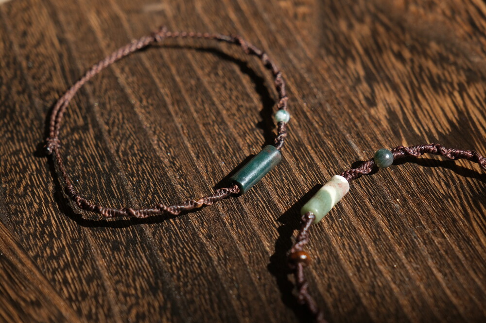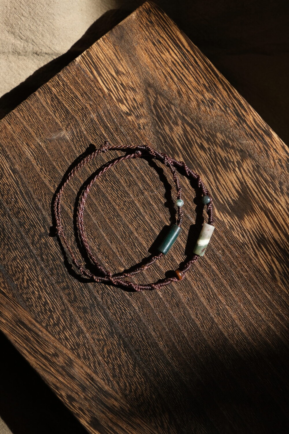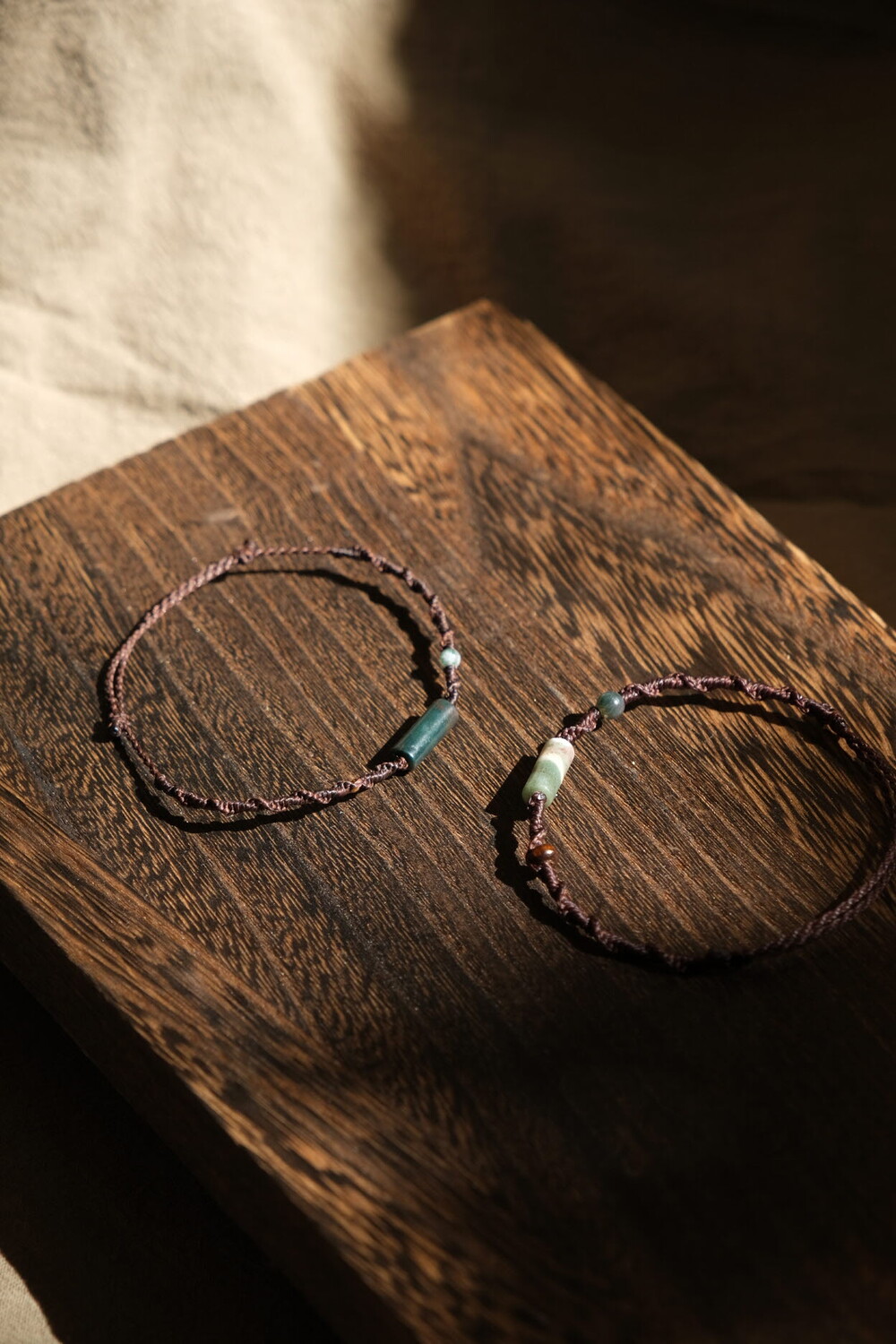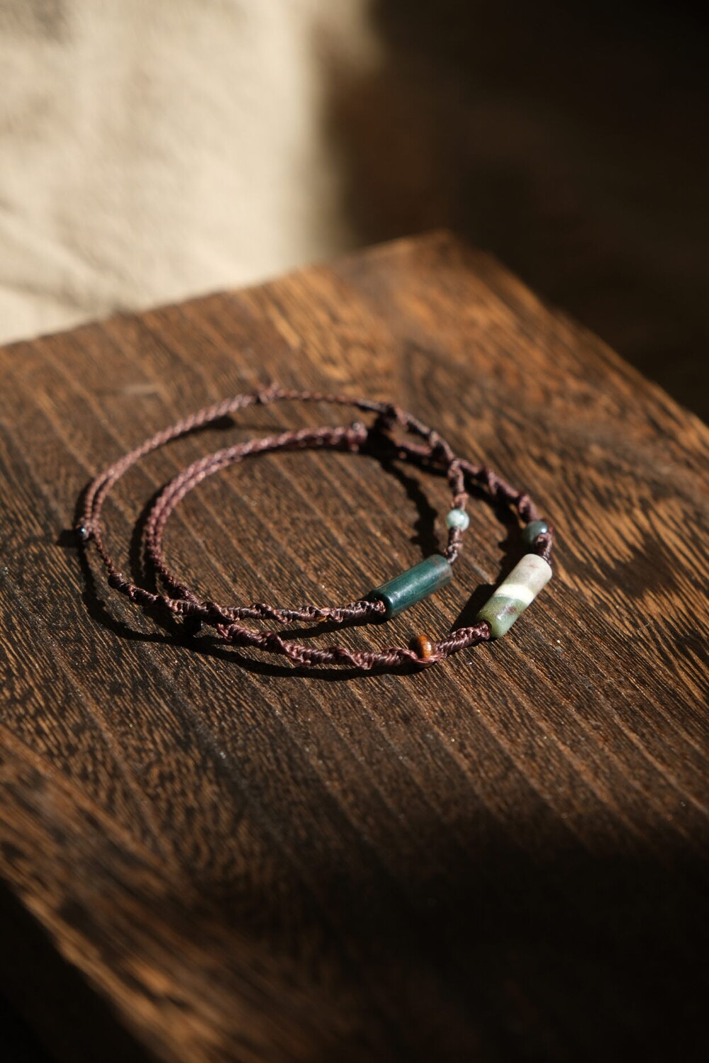 원형 막대 모양의 원석으로 제작한 매듭 팔찌입니다.