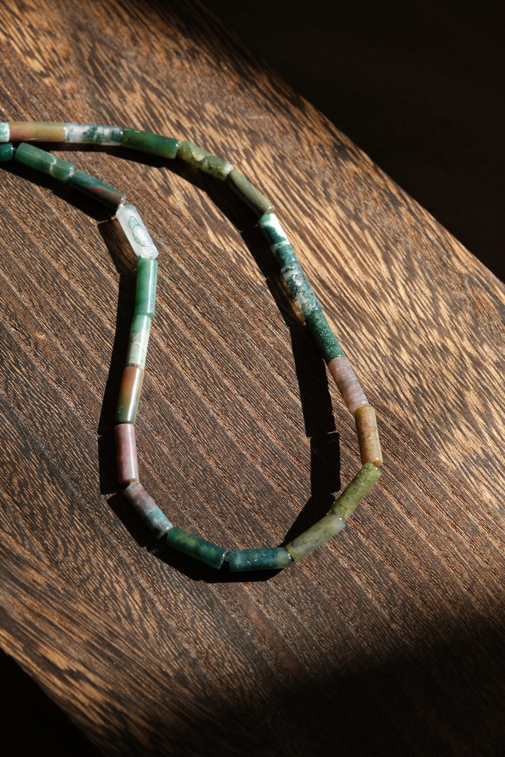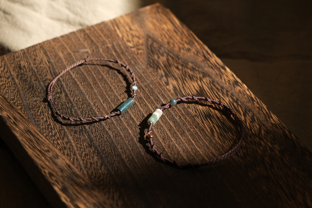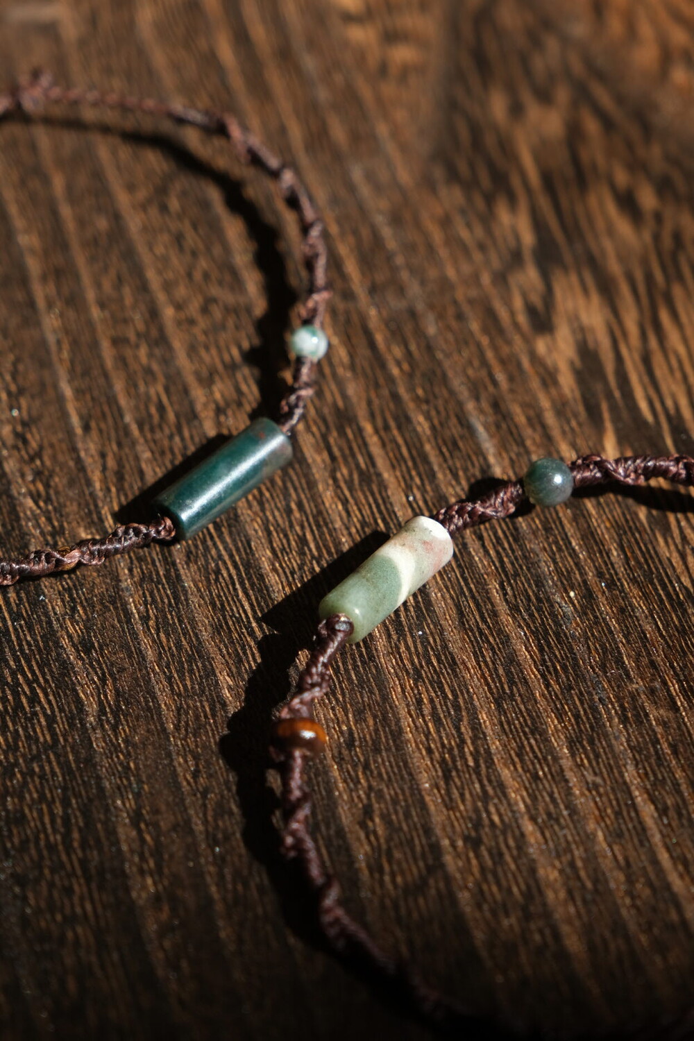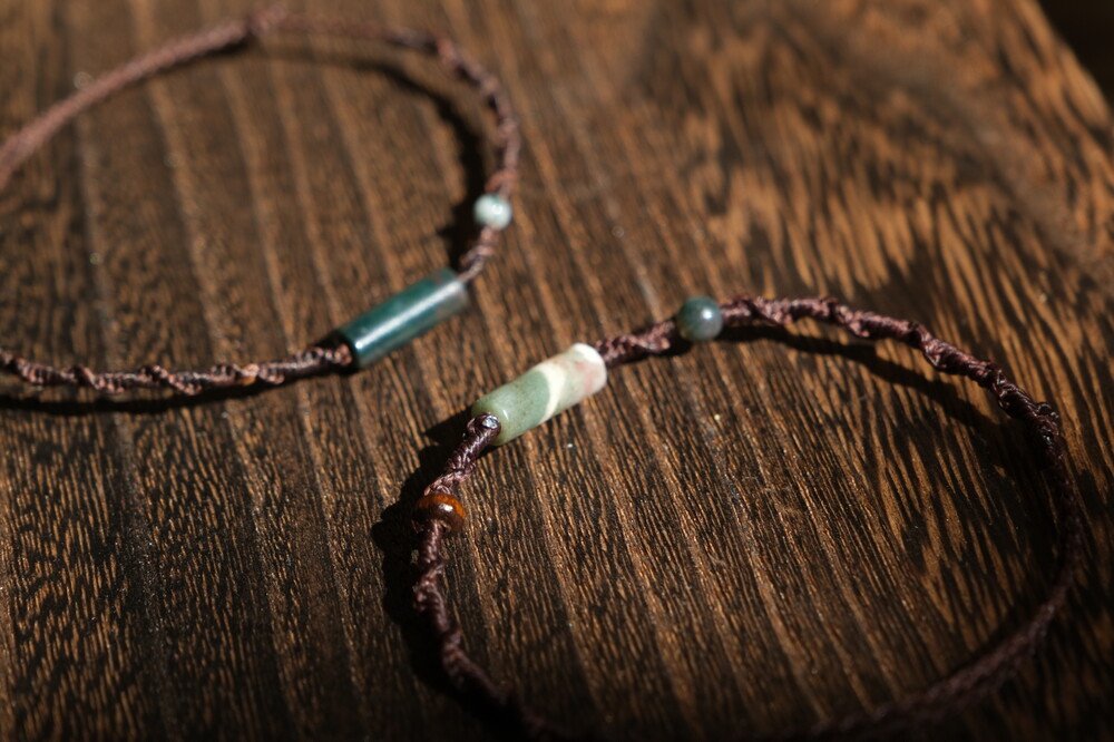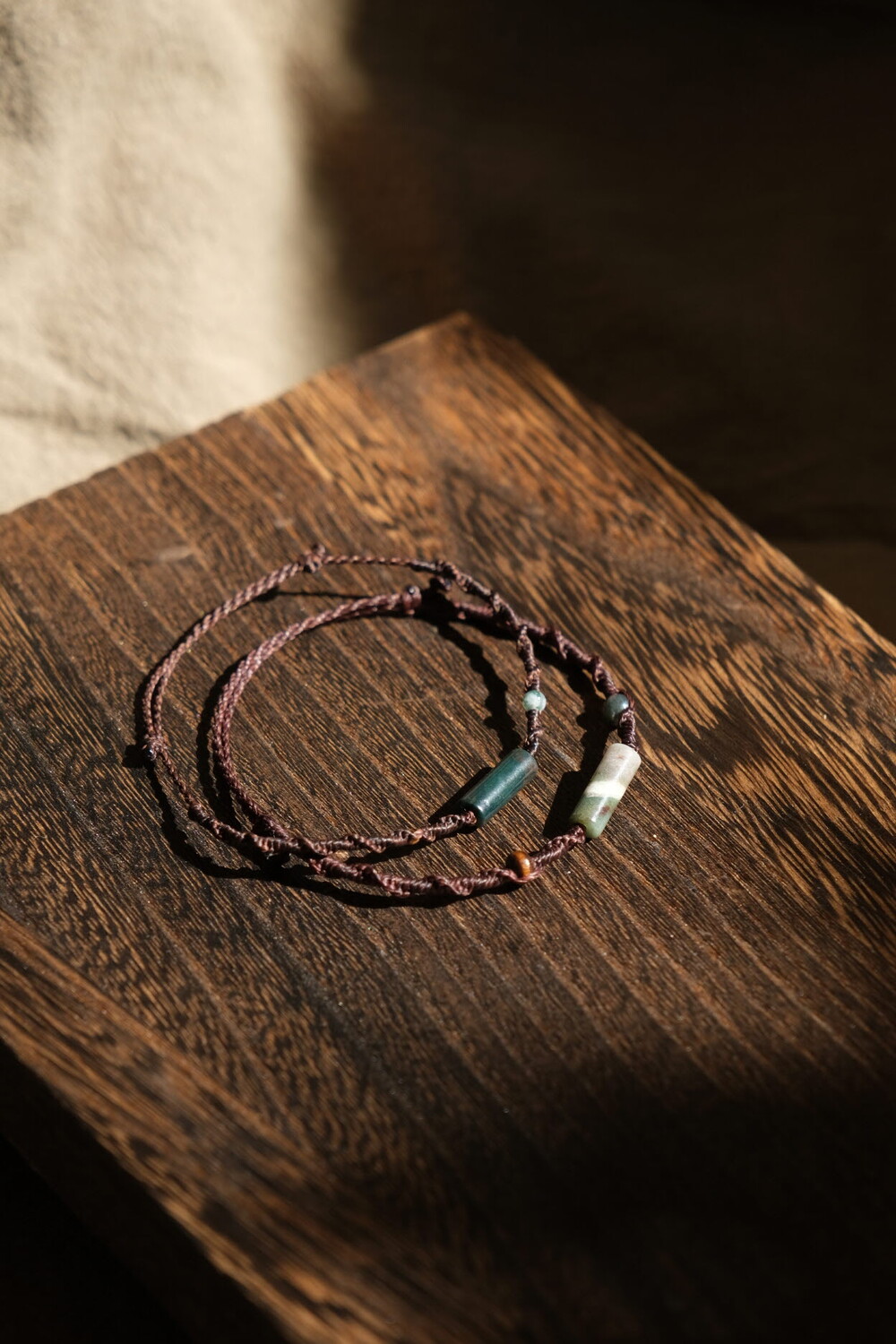 원형 막대 모양의 원석으로 제작한 매듭 팔찌입니다.