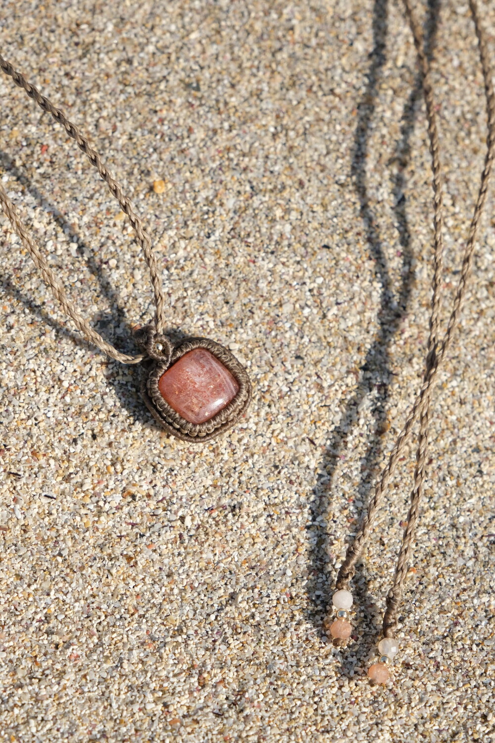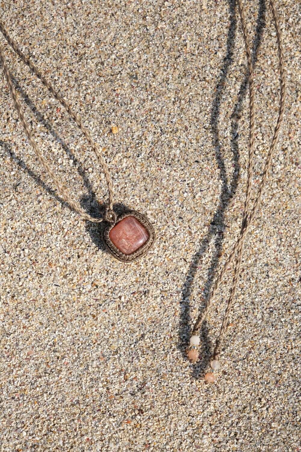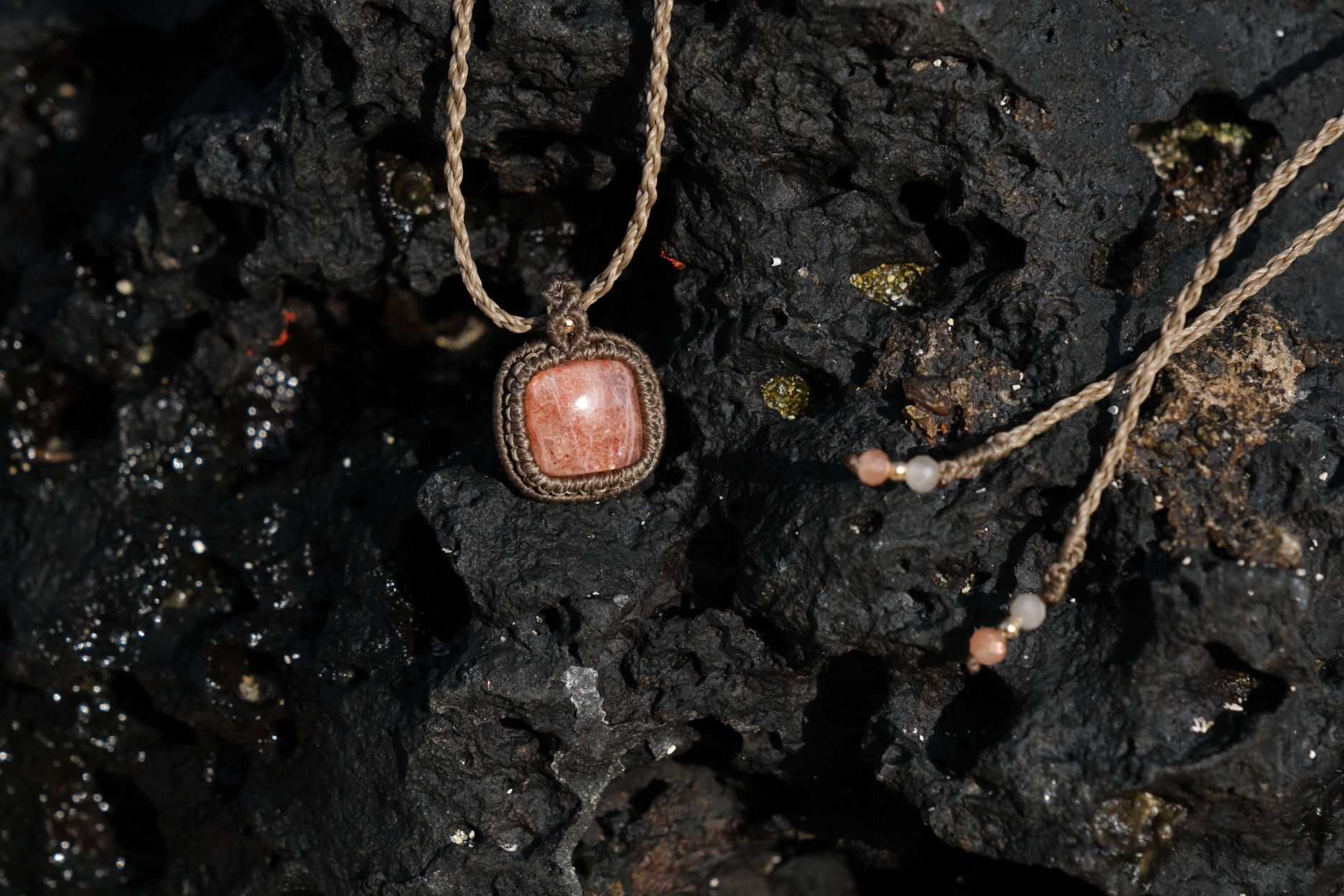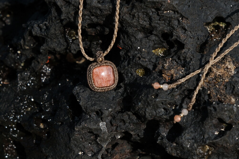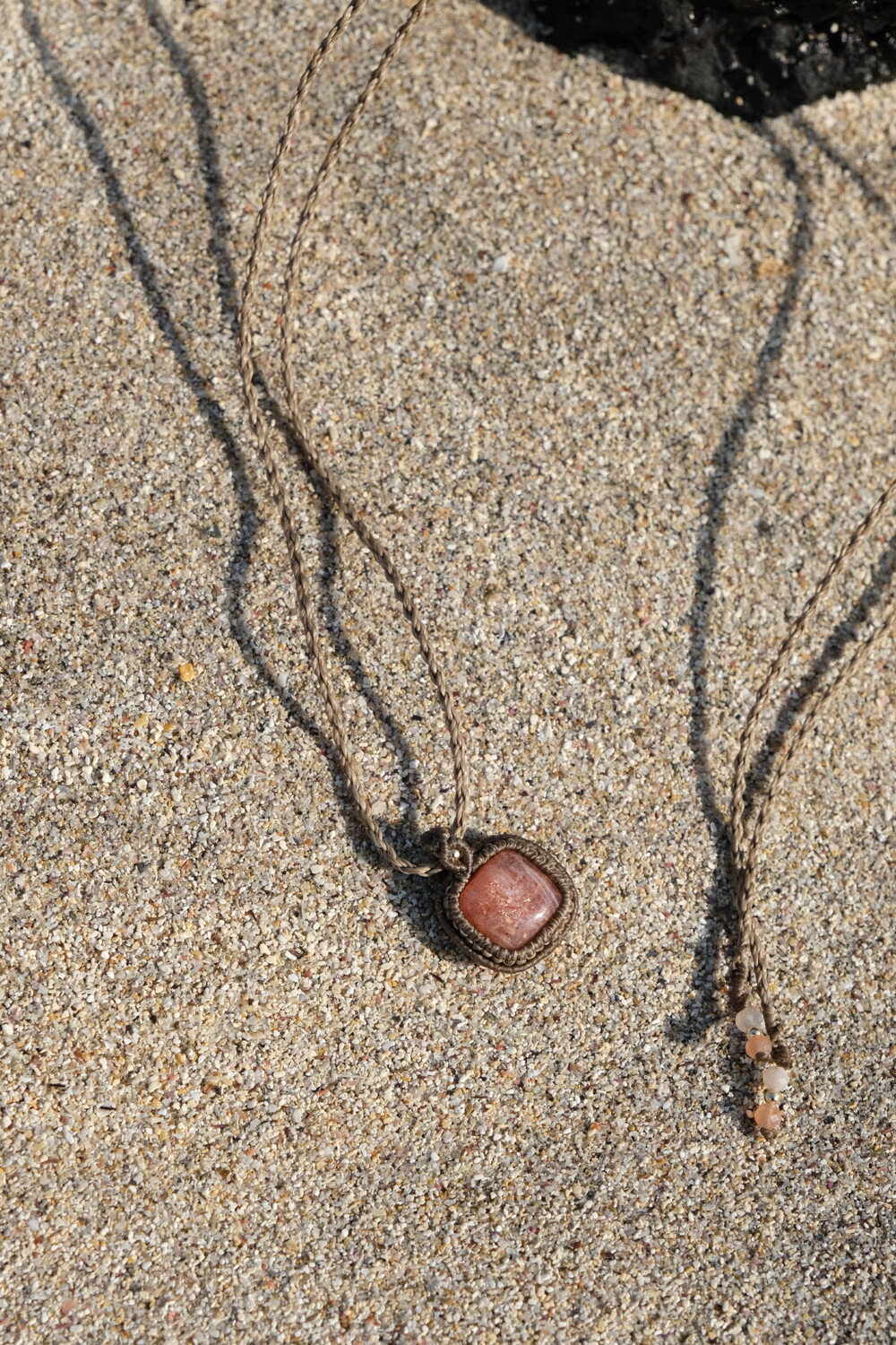 정사각 모양의 썬스톤을 두번 감싸 섬세하게 작업한 목걸이입니다.