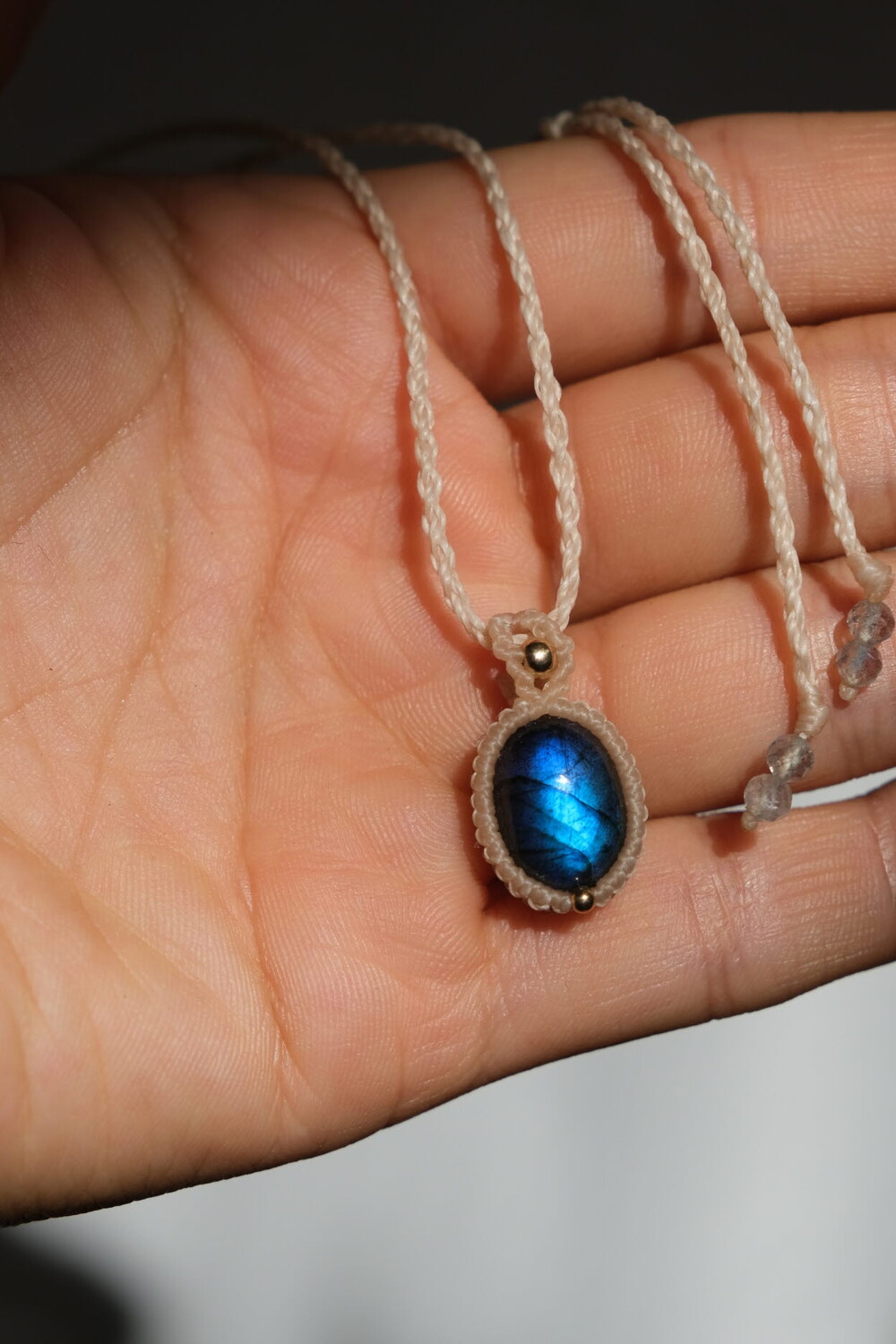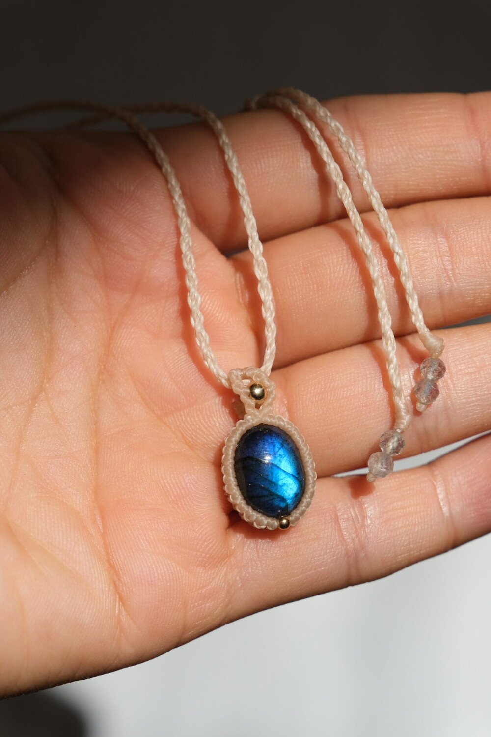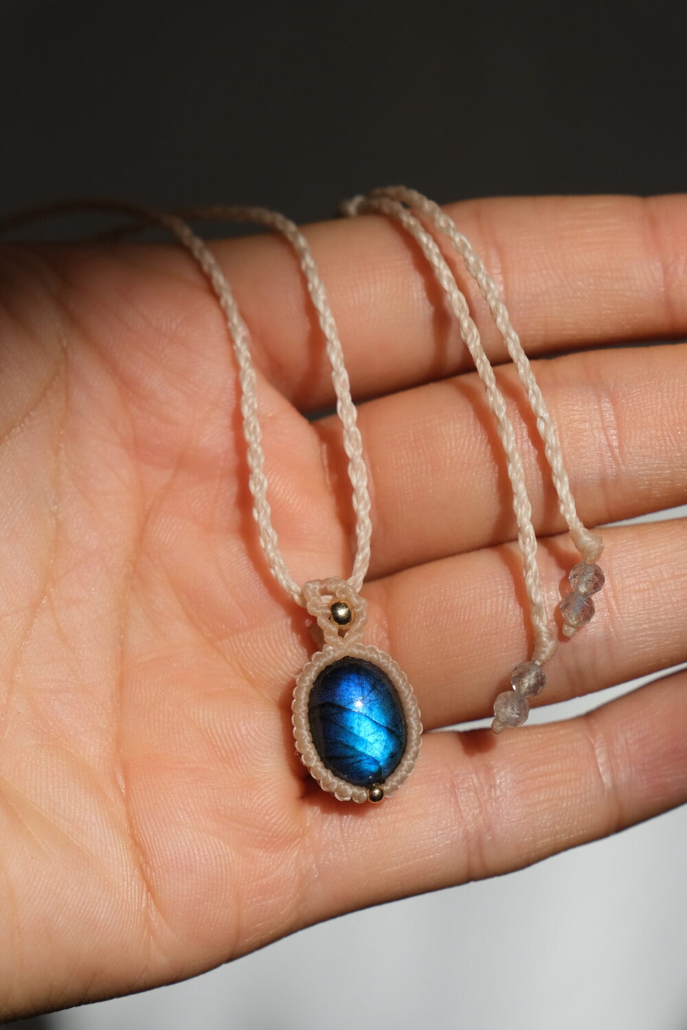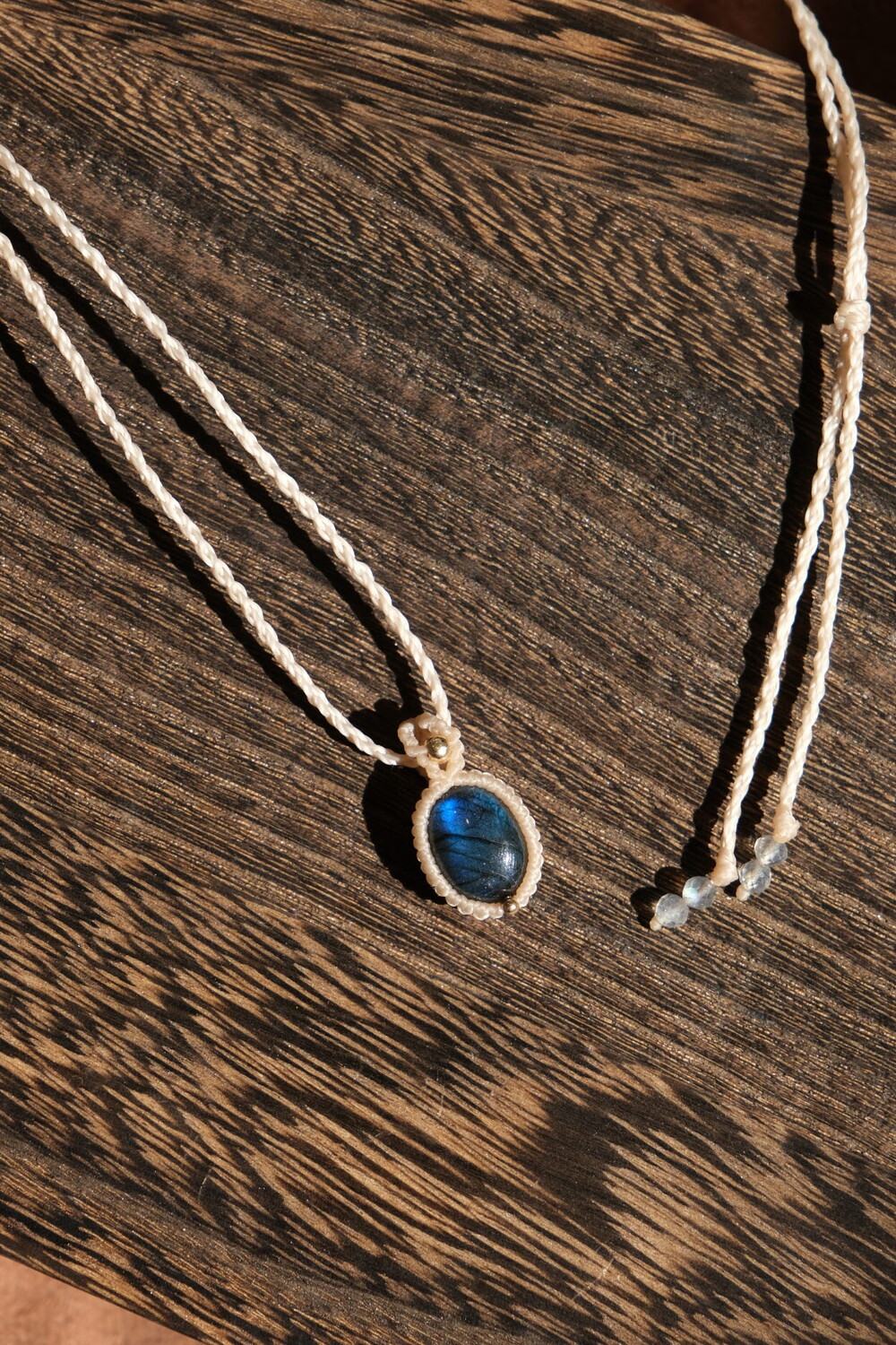 짙은 색의 블루를 지닌 라브라도라이트를 감싸 만든 목걸이입니다.