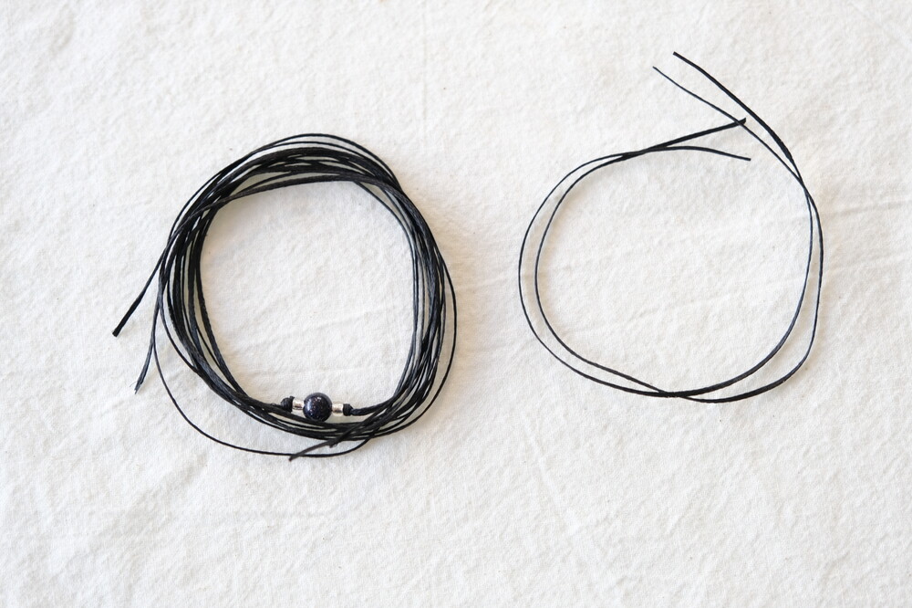 길이조절 매듭을 두개 만들어 완성하는 초커로, 목 둘레를 따라 작 감기게 착용 가능합니다.