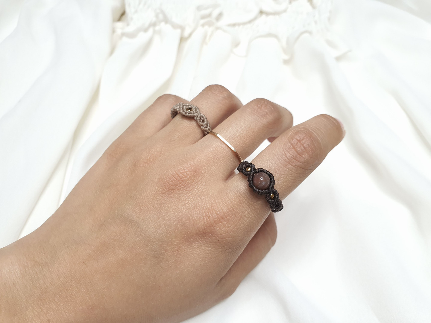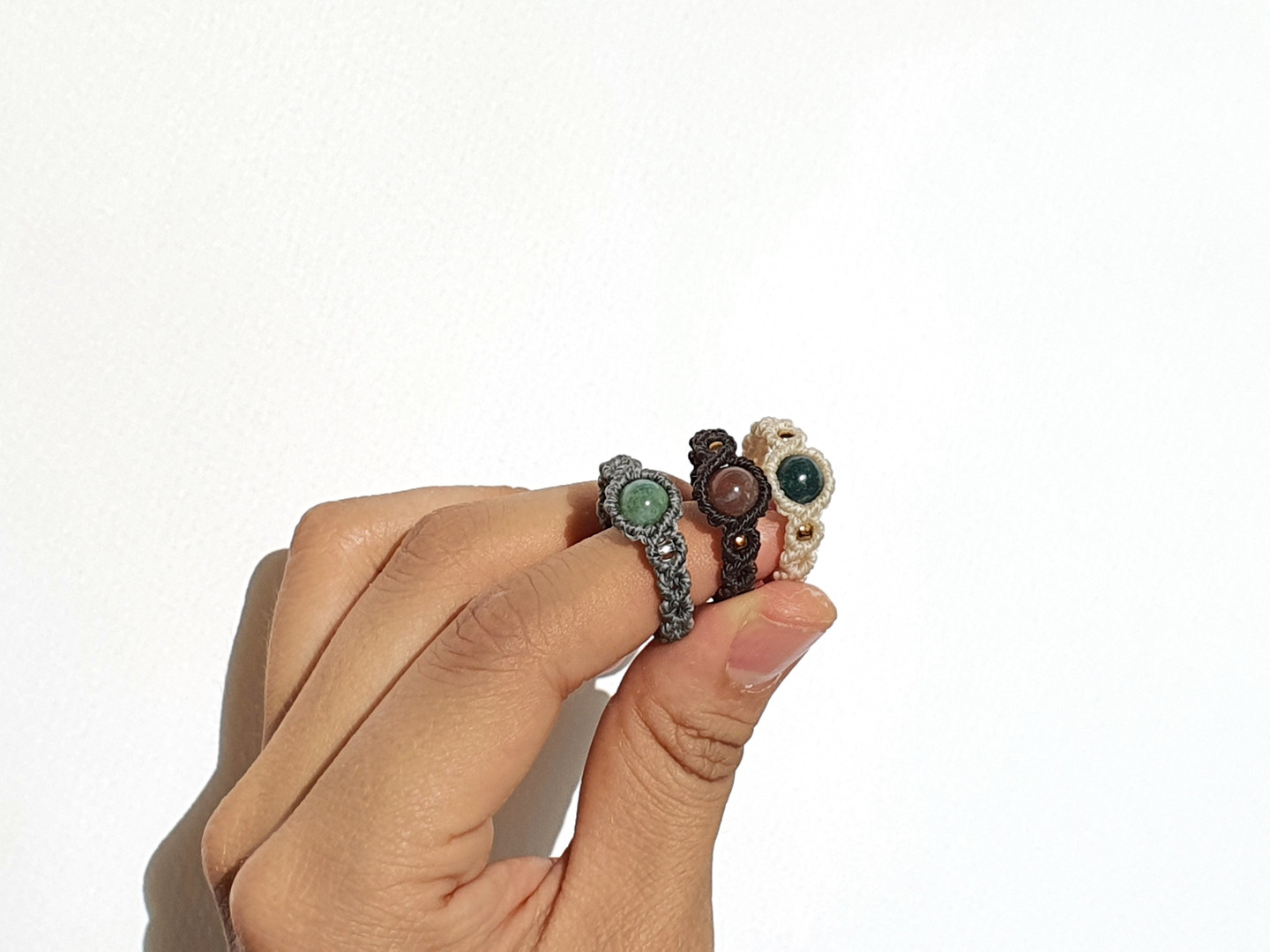 구슬원석과 비즈를 이용해 매듭반지를 한층 더 고급스럽게 만들어주었어요.