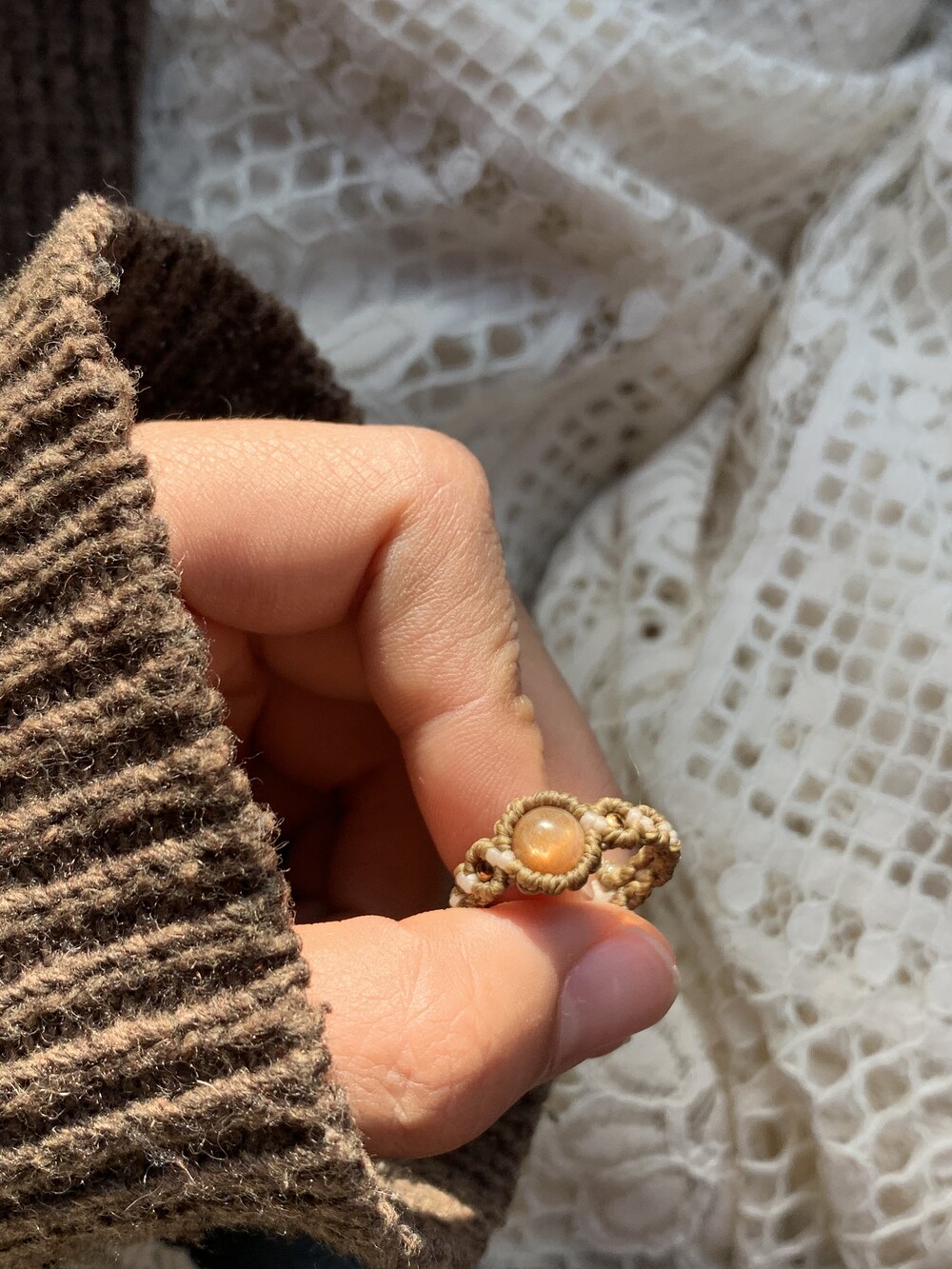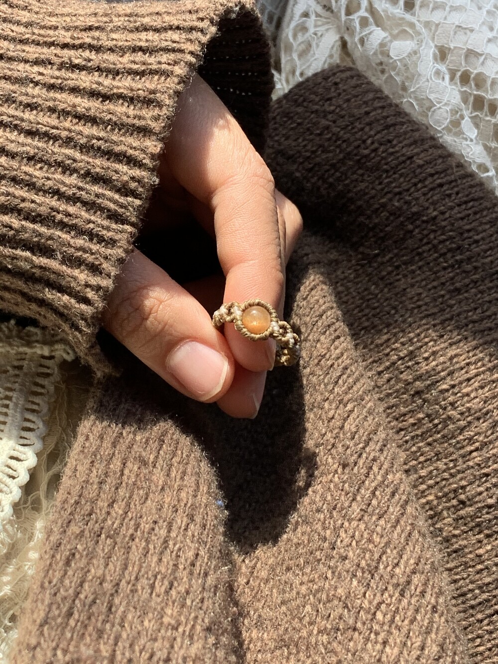 따뜻한 색감의 선스톤과 어울리는 그린브라운 색상과 아이보리 믹스로 만들어진 작품입니다.