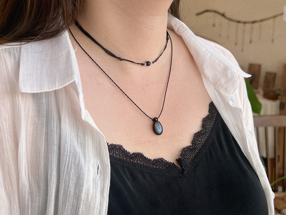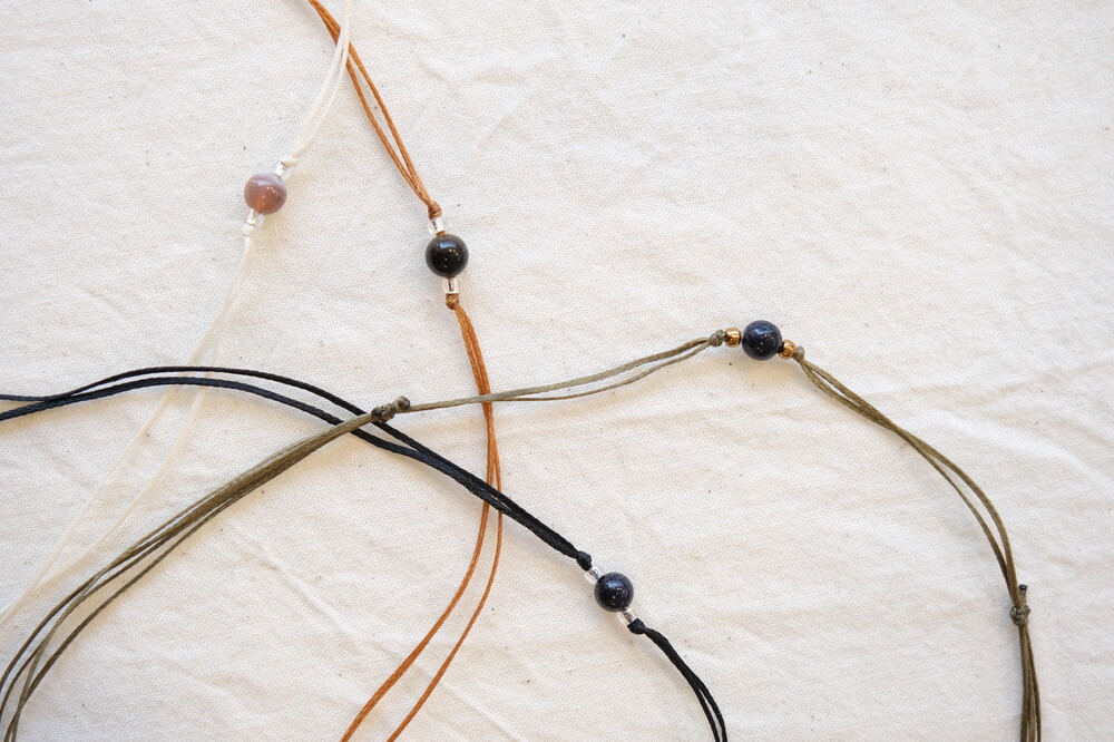 길이 조절이 가능하도록 2개의 길이 조절 매듭으로 마감한 작품입니다.